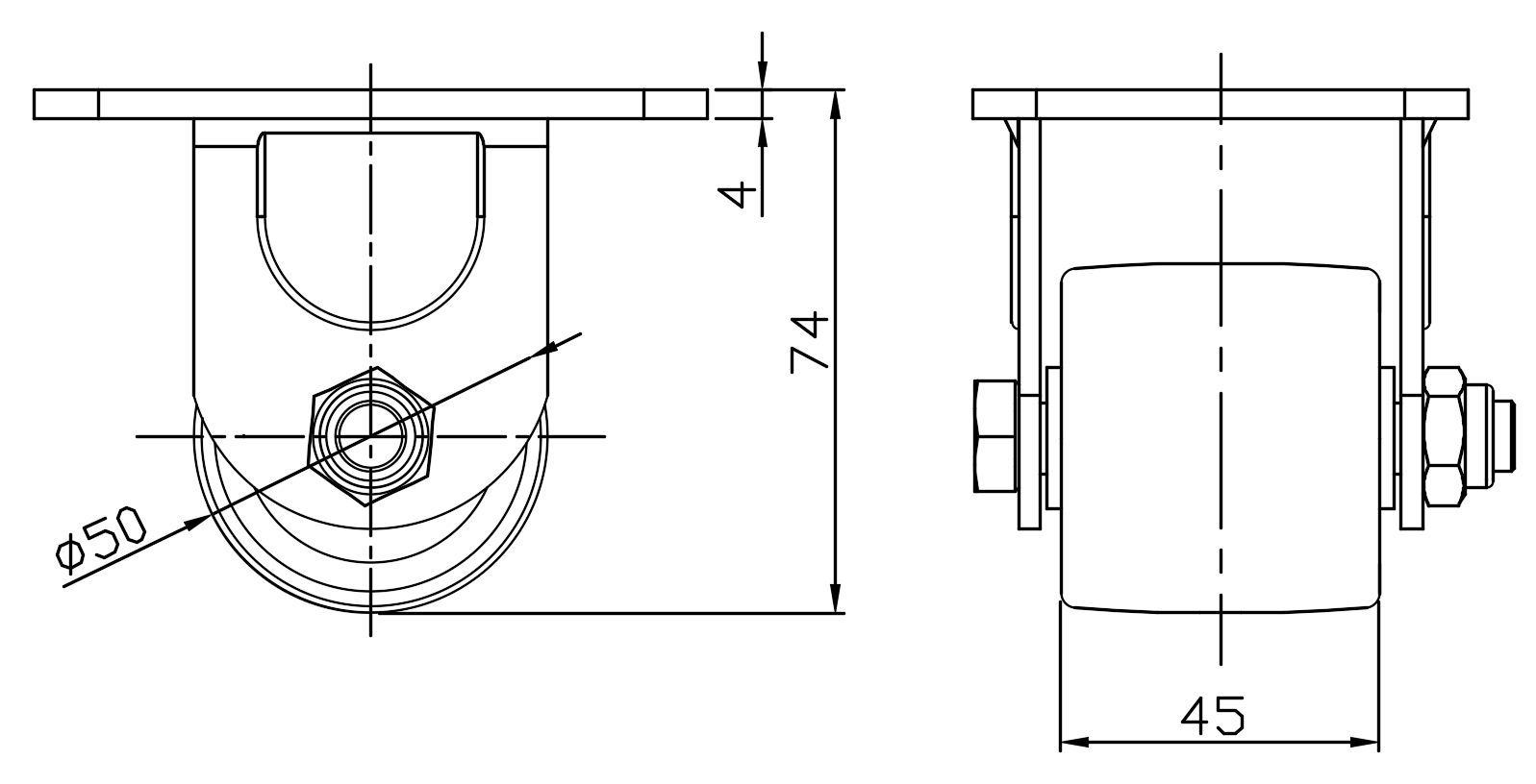 Bề mặt mạ kẽm, thiết bị lắp đế Lõi bánh xe và bề mặt bánh xe bằng nhựa nhiệt dẻo Đen, ổ trục bánh xe - bi chính xác. |