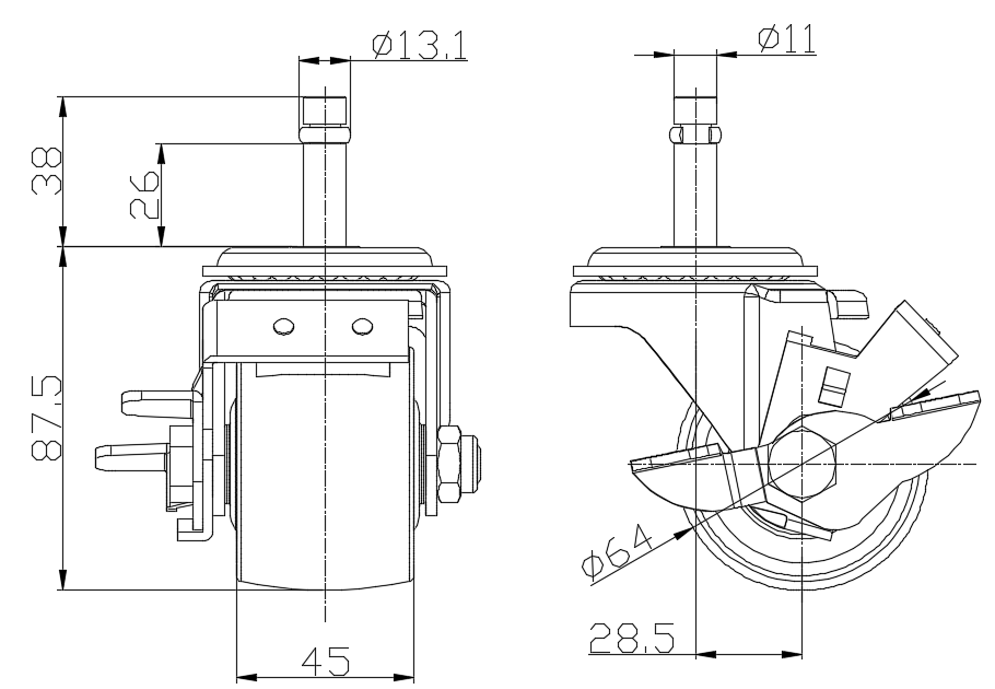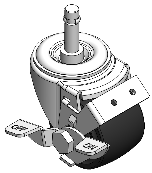Bánh xe có phanh bên và hệ thống khóa. Chân bánh xe được dập, tán đinh—