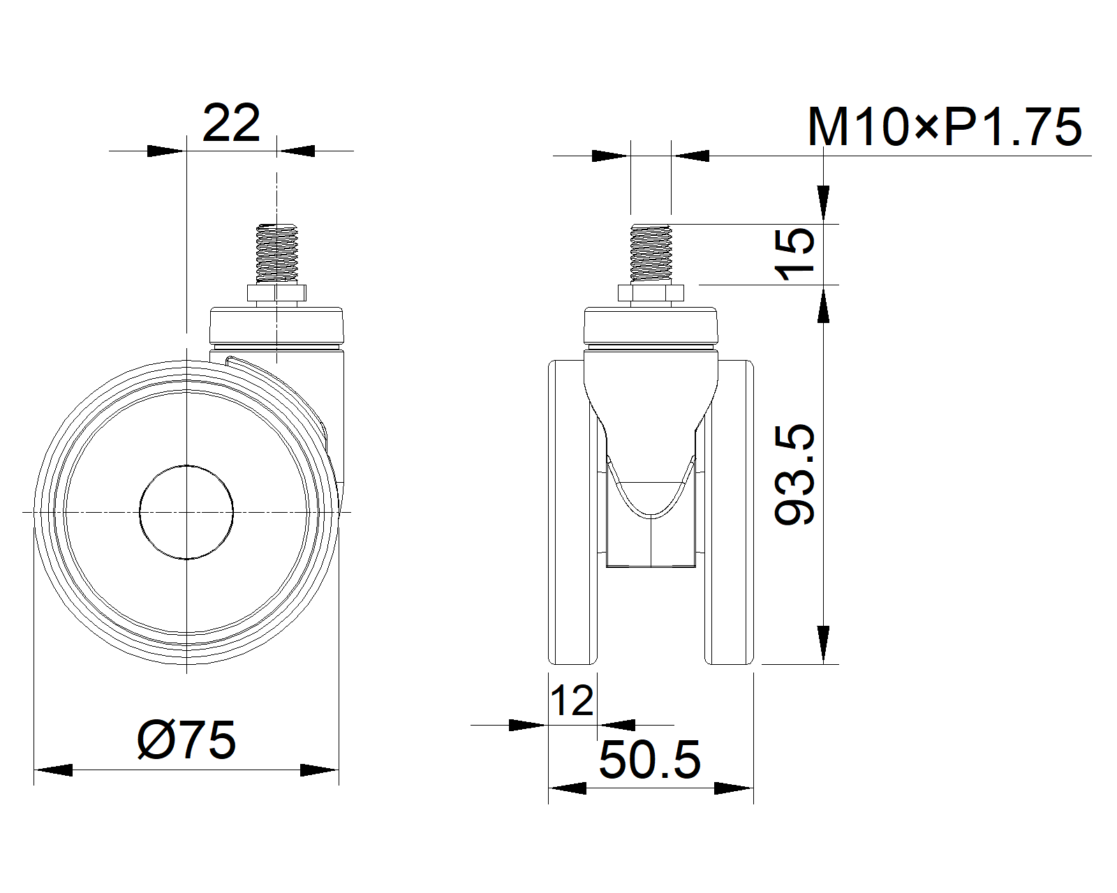 丝扣规格 M10 丝扣长度 15mm 偏心距 22mm 旋转干涉 132mm 总高 119mm 旋转半径 66mm 硬度 82±5° Shore A 荷重(动态) 30kgs |
