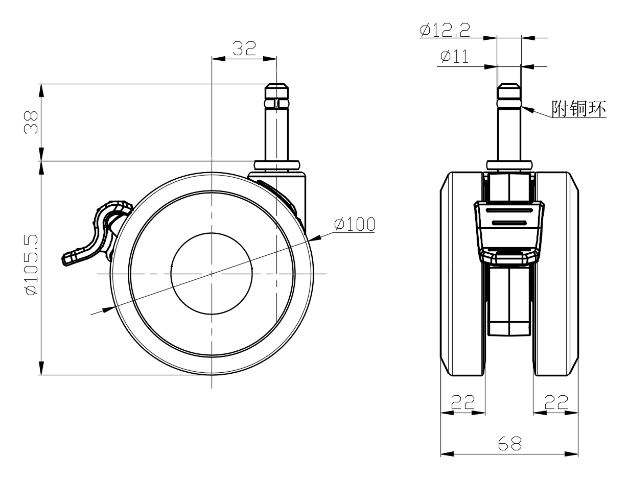 | 配有单煞式锁定系统的脚轮,插心铆合注塑轮架—∅11x38L