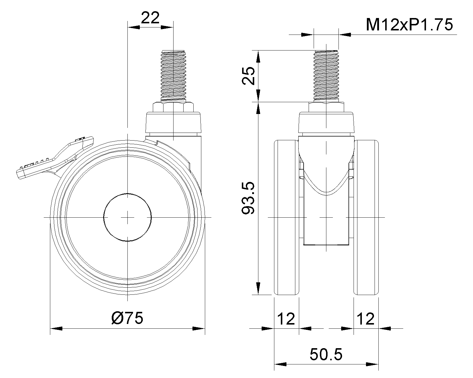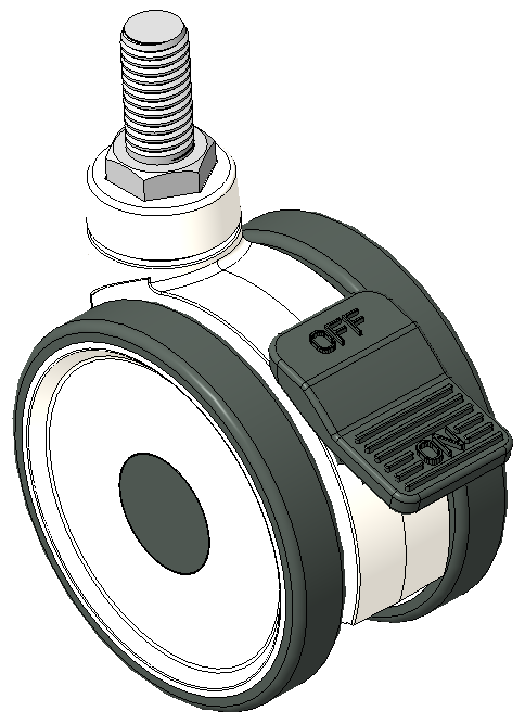 Total Brake Caster, M12x25 thread, white Fork with reinforced Polypropylene Rustproof, Corrosion resistant, Attractive appearance, Economical, and flexible High-Quality Impact-Resistant Polypropylene Wheel Center, High-Quality Reinforced Polypropylene Rubber (TPR) Wheel Tread Dark gray, Plain Bearing |