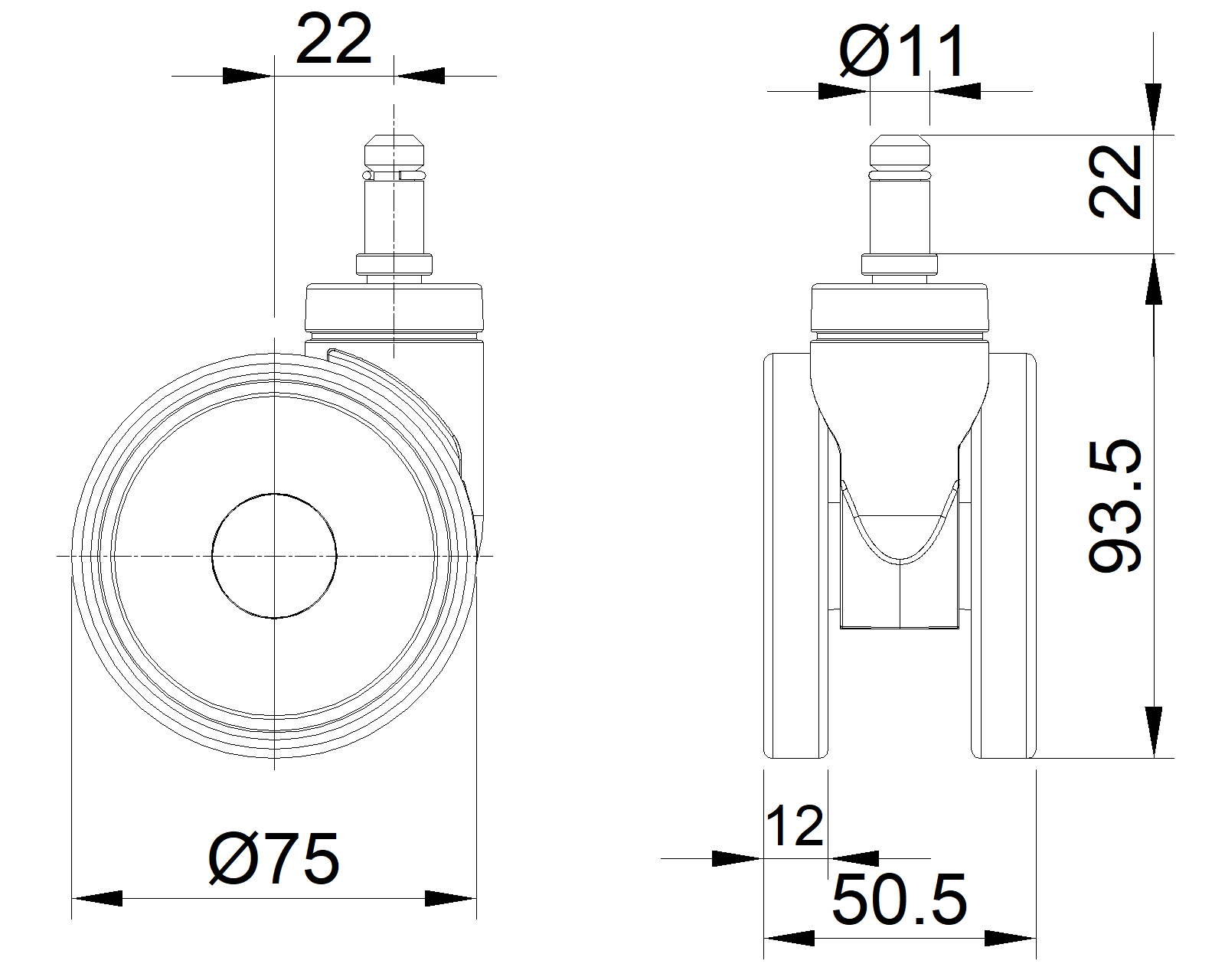 Swivel double ball Caster with Ø11x22" stem and white Fork reinforced with High-quality Impact Resistance Polypropylene. Rustproof, Corrosion resistant, attractive, Economical, and Reinforced. High-quality Impact Resistance Polypropylene core with High-Quality Thermoplastic Rubber (TPR) Wheel Tread and C-ring. Dark gray, Anti-thread wheel cover. |