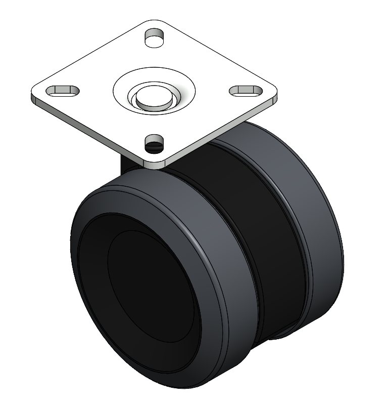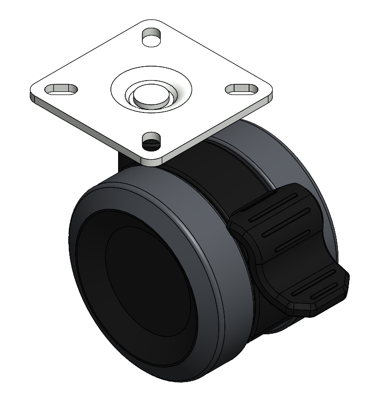 Swivel Caster with injection-molded Fork Riveted to Top Plate. reinforced Polypropylene Fork, Top Plate (3T) Mounting Type system Polypropylene (PP) core, polyvinyl chloride (PVC) tread Dark gray, Anti-thread wheel cover. |