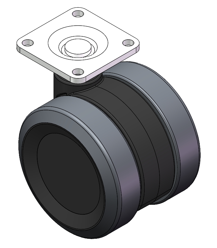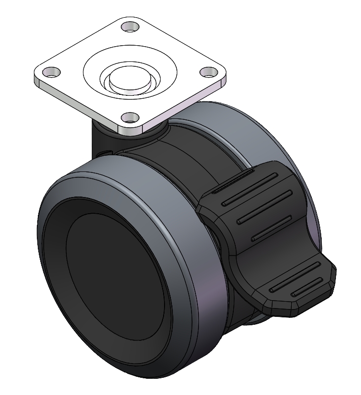 Swivel Caster with injection-molded Fork Riveted to Top Plate. reinforced Polypropylene Fork, Top Plate (3T) Mounting Type system Polypropylene (PP) core, polyvinyl chloride (PVC) tread Dark gray, Anti-thread wheel cover. |