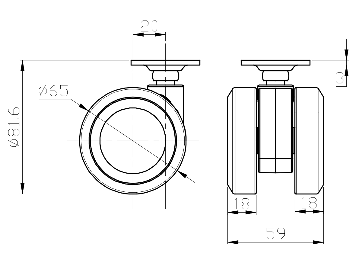 Wheel Tread: PVC polyvinyl chloride Wheel Center: PP polypropylene Drawings are for reference only and may differ from the product |