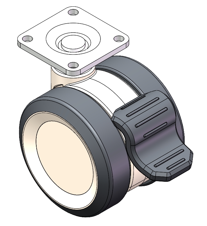 Single Brake locking system and a Fork-Riveted, injection-molded Fork. reinforced Polypropylene Fork with Fork-mount (3T) Mounting Type system Polypropylene (PP) Wheel Center, polyvinyl chloride (PVC) tread White-dark gray, wheel - Plain Bearing. |