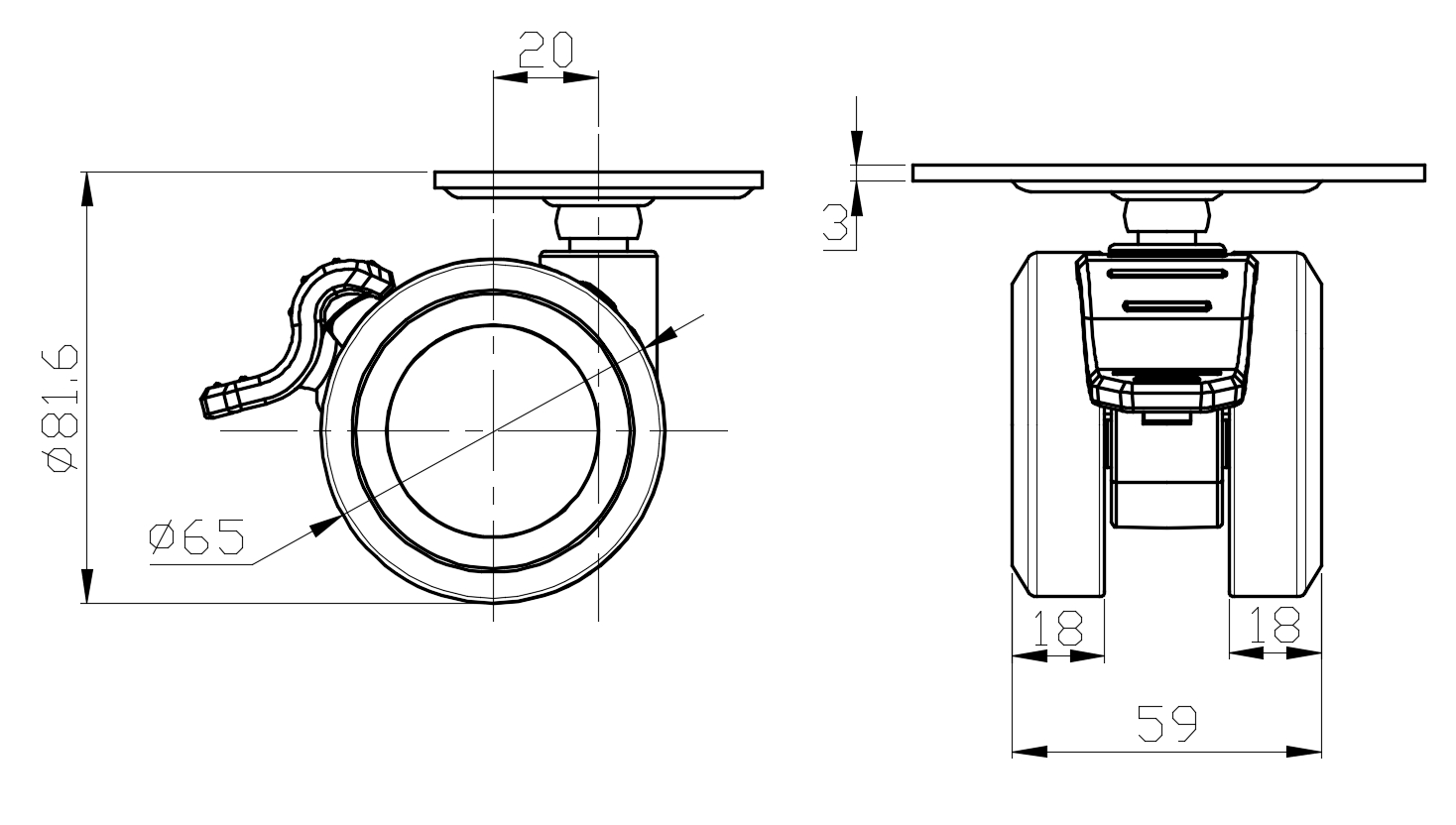 Wheel Tread: PVC polyvinyl chloride Wheel Center: PP polypropylene Drawings are for reference only and may differ from the product |
