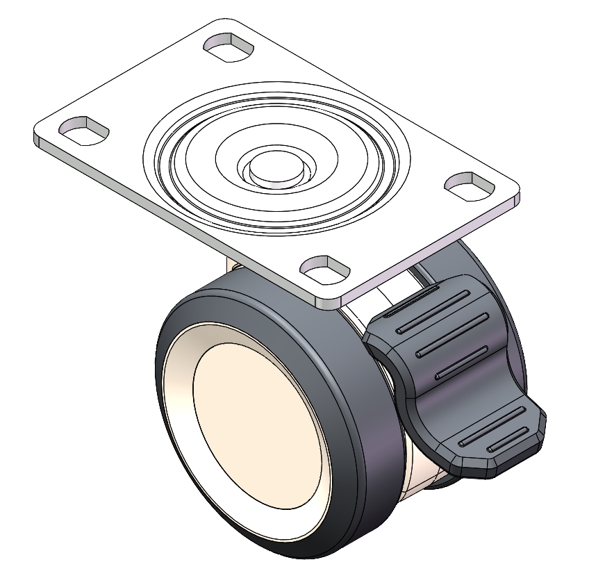 Single Brake locking system and a Fork-Riveted, injection-molded Fork. reinforced Polypropylene Fork with Fork-mount (3T) Mounting Type system Polypropylene (PP) Wheel Center, polyvinyl chloride (PVC) tread White-dark gray, wheel - Plain Bearing. |