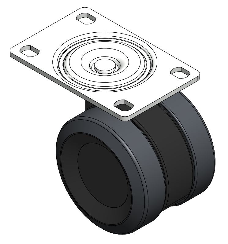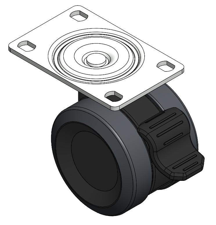 Swivel Caster with injection-molded Fork Riveted to Top Plate. reinforced Polypropylene Fork, Top Plate (3T) Mounting Type system Polypropylene (PP) core, polyvinyl chloride (PVC) tread Dark gray, Anti-thread wheel cover. |