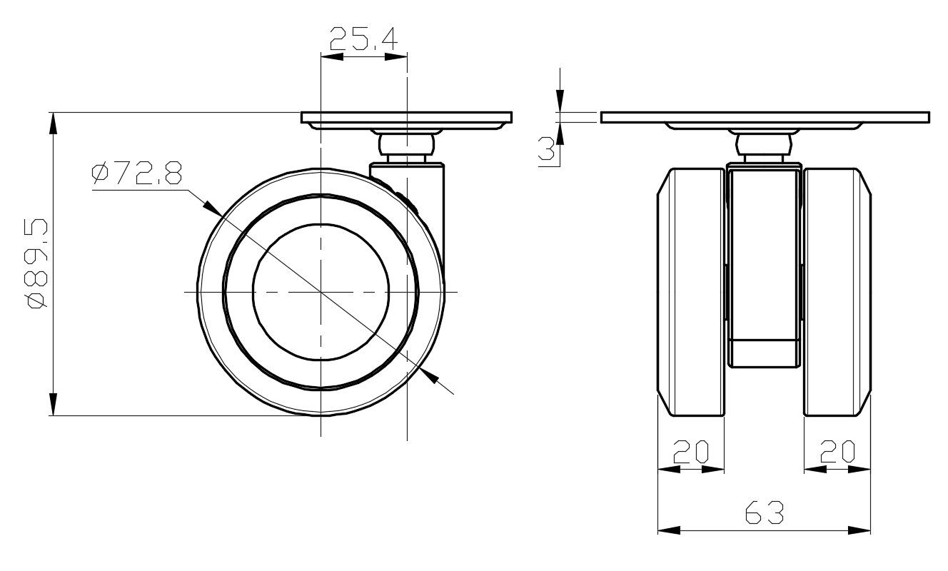Wheel Tread: PVC polyvinyl chloride Wheel Center: PP polypropylene Drawings are for reference only and may differ from the product |