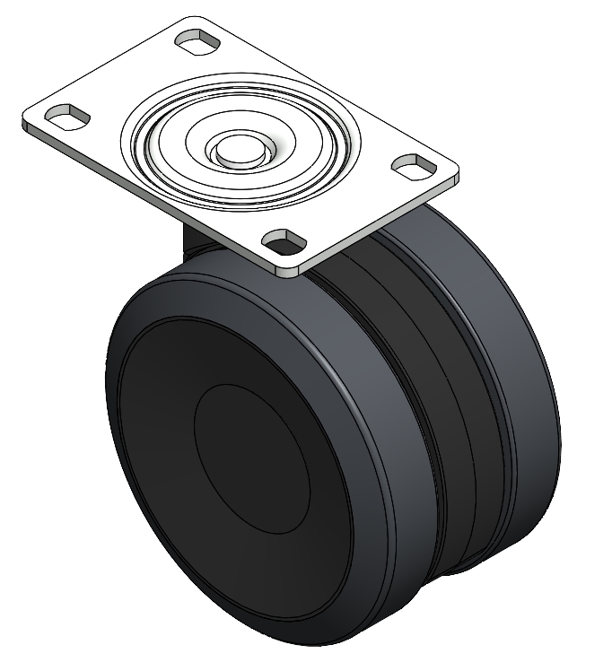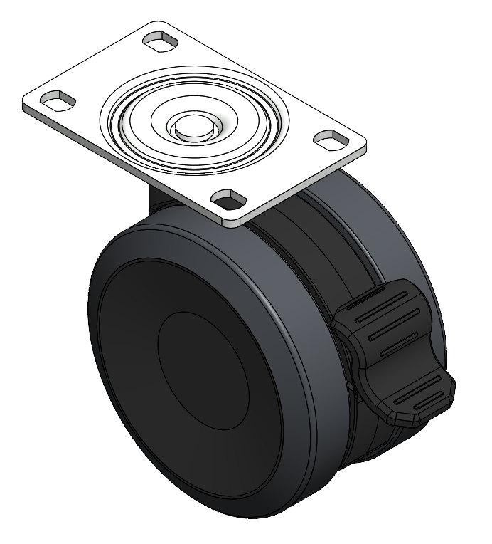 Swivel Caster with injection-molded Fork Riveted to Forkplate. reinforced Polypropylene Fork, Top Platetype (3T) Mounting Type system Polypropylene (PP) Wheel Center, polyvinyl chloride (PVC) tread Dark gray, Bearing—Ball Bearing. |