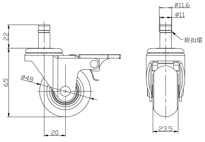 Casters with a Wheel Brake With locking system. Stamping, Riveted Fork—Ø11x22L.