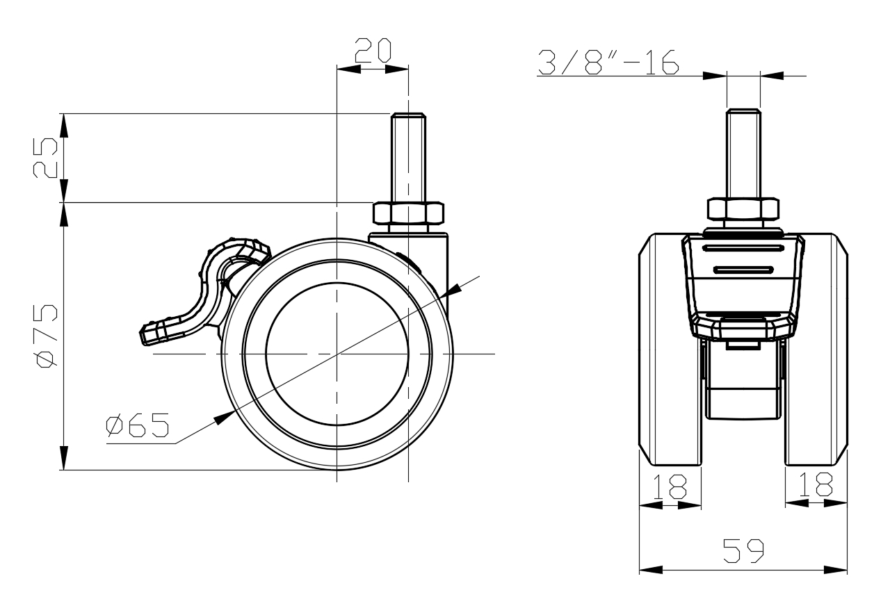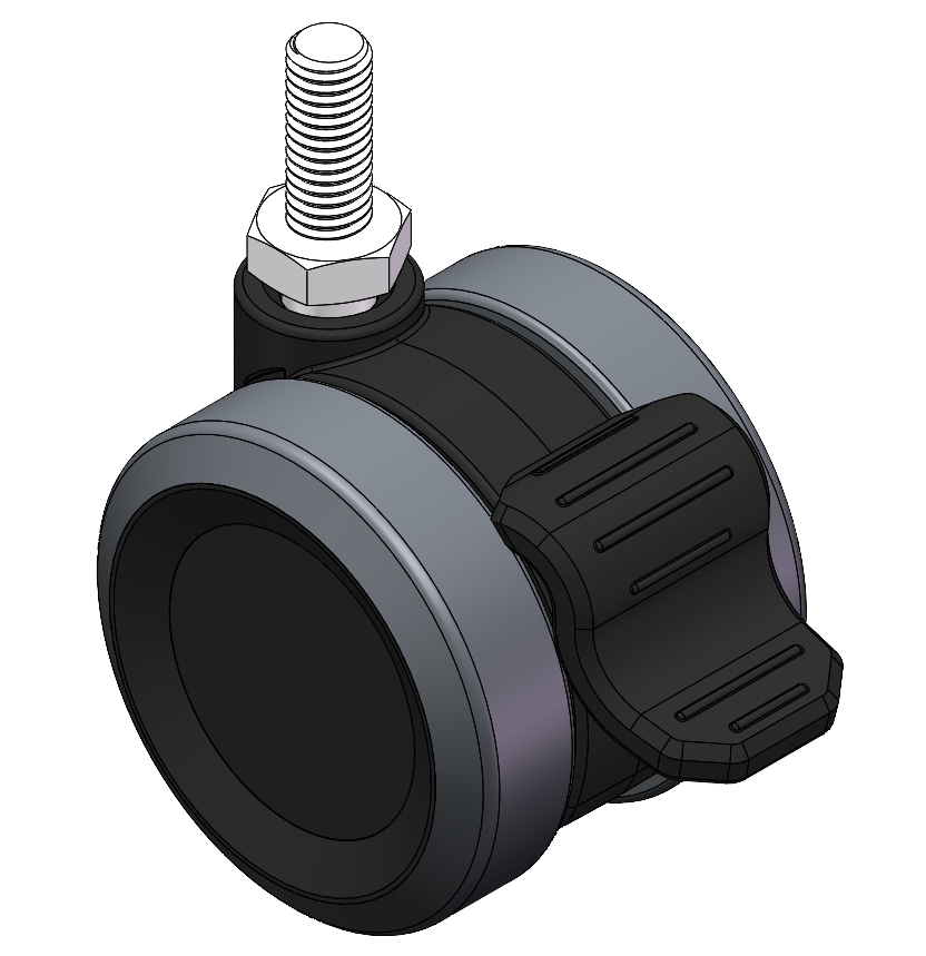 Caster with a single-brake With locking system, thread-Riveted, Injection Molding Fork (3/8"-16).