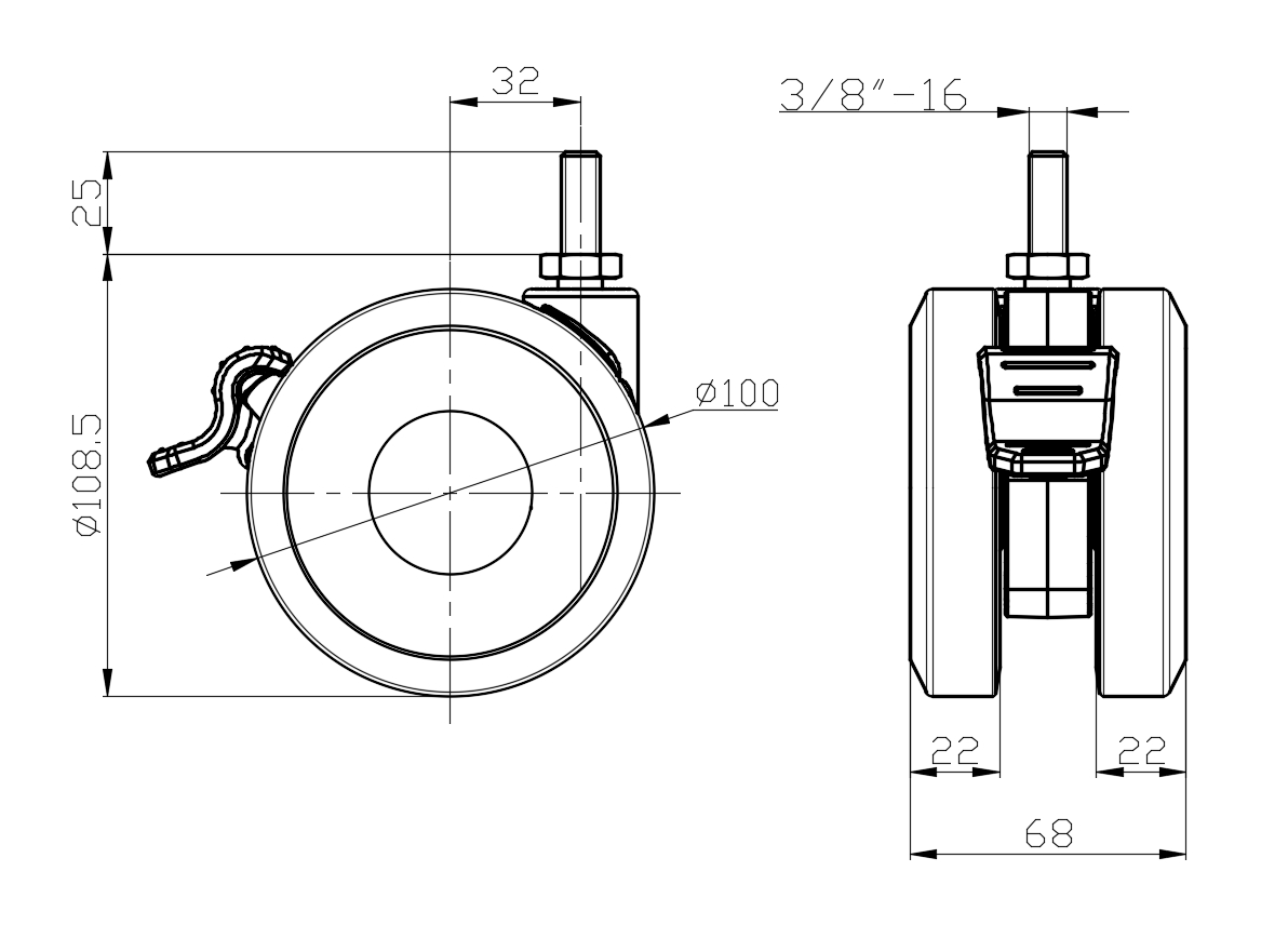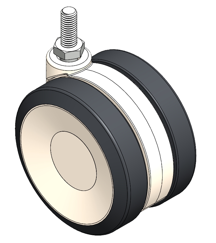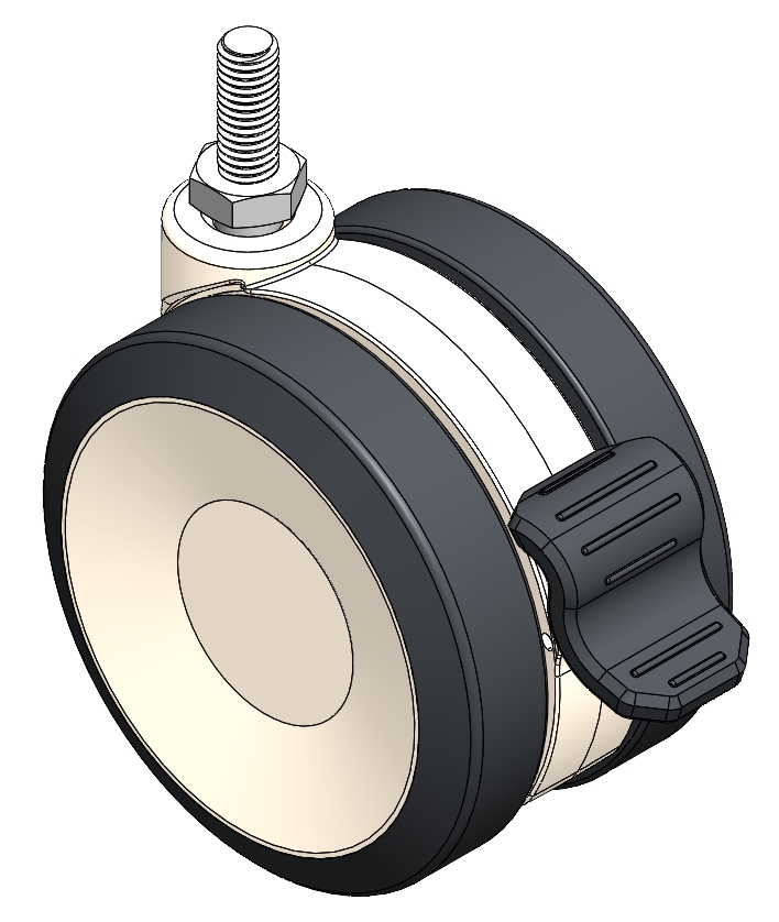 Caster with a single-brake With locking system, thread-Riveted, Injection Molding Fork (3/8"-16). reinforced Polypropylene Fork, Mounting Type - Threaded Stem. Polypropylene (PP) core, polyvinyl chloride (PVC) Wheel Tread. White-dark gray. Bearings: Ball Bearings. |