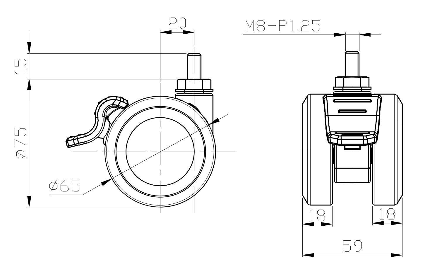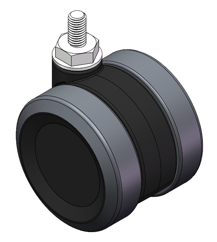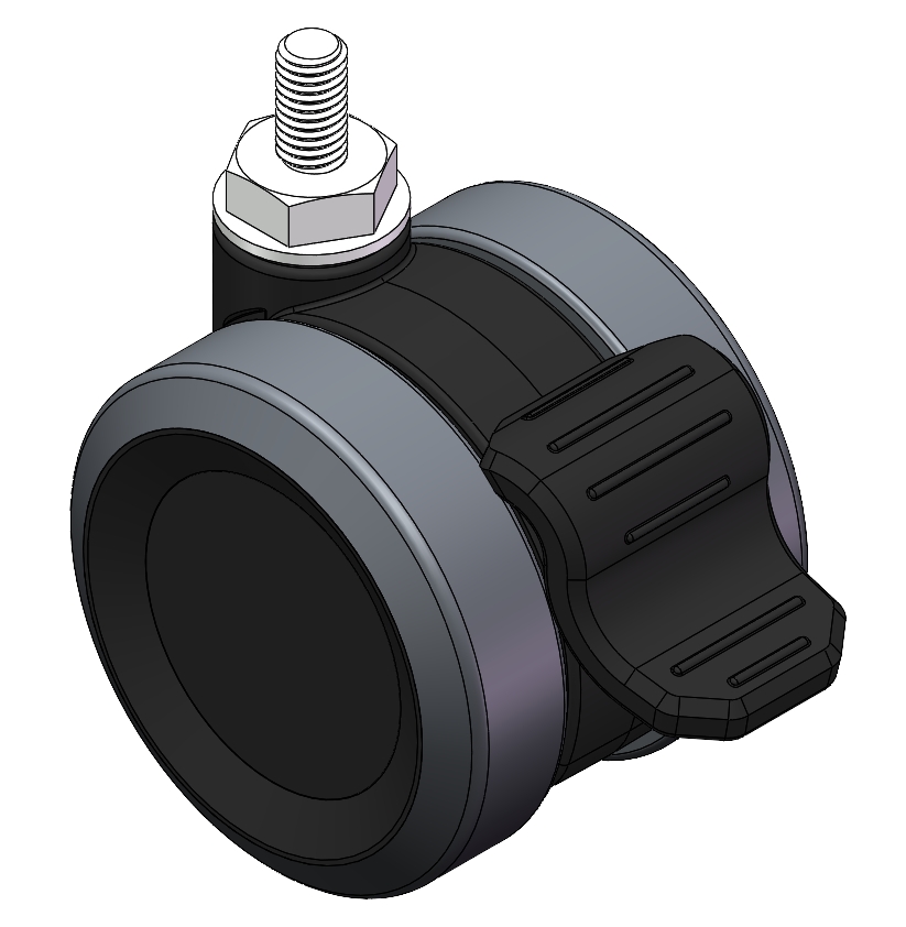 Single Brake locking system, thread-Riveted injection-molded Fork (M8-P1.75). reinforced Polypropylene Fork, Mounting Type - Threaded Stem. Polypropylene (PP) core, polyvinyl chloride (PVC) tread. Dark gray, Anti-thread wheel cover. |