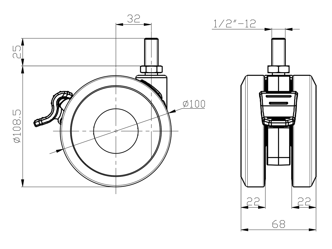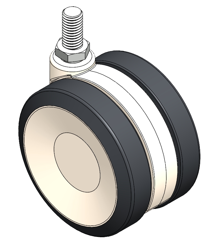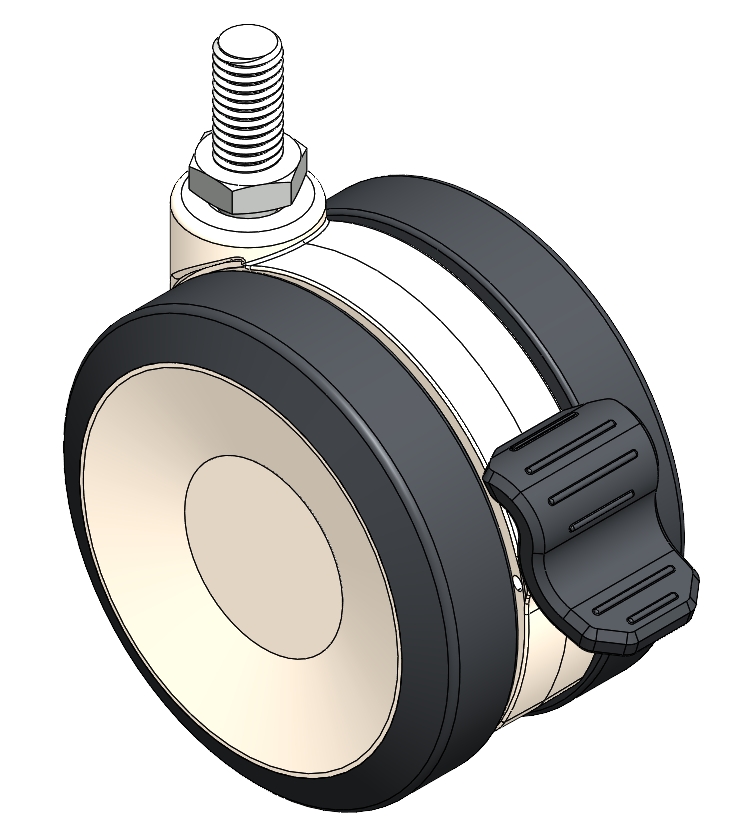 Caster with a single-brake With locking system, thread-Riveted, Injection Molding Fork (1/2"-12). reinforced Polypropylene Fork, Mounting Type - Threaded Stem. Polypropylene (PP) core, polyvinyl chloride (PVC) Wheel Tread. White-dark gray. Bearings: Ball Bearings. |