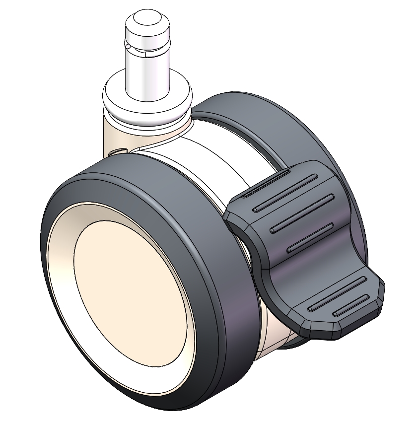 Single Brake locking system, insert-Riveted, injection-molded Fork (Ø 11 x 22L). reinforced Polypropylene Fork, insert-type Mounting Type mechanism. Polypropylene (PP) core, polyvinyl chloride (PVC) tread. White-dark gray, wheel with Plain Bearing design. |