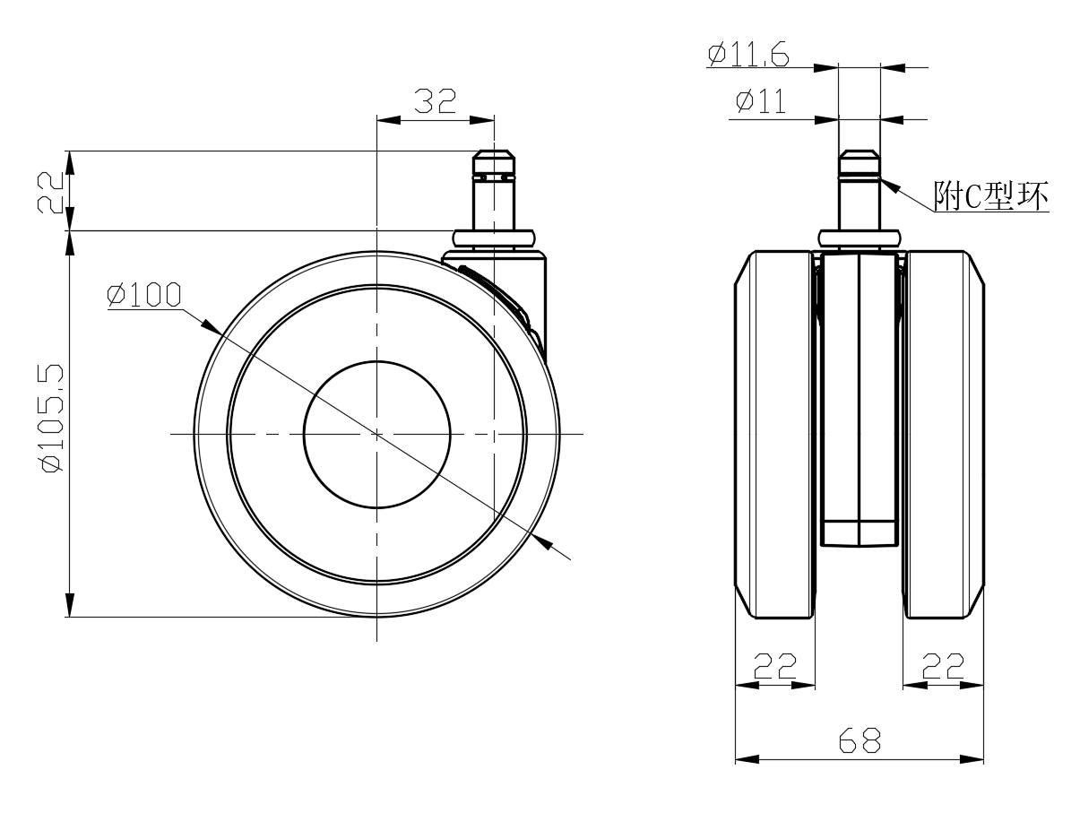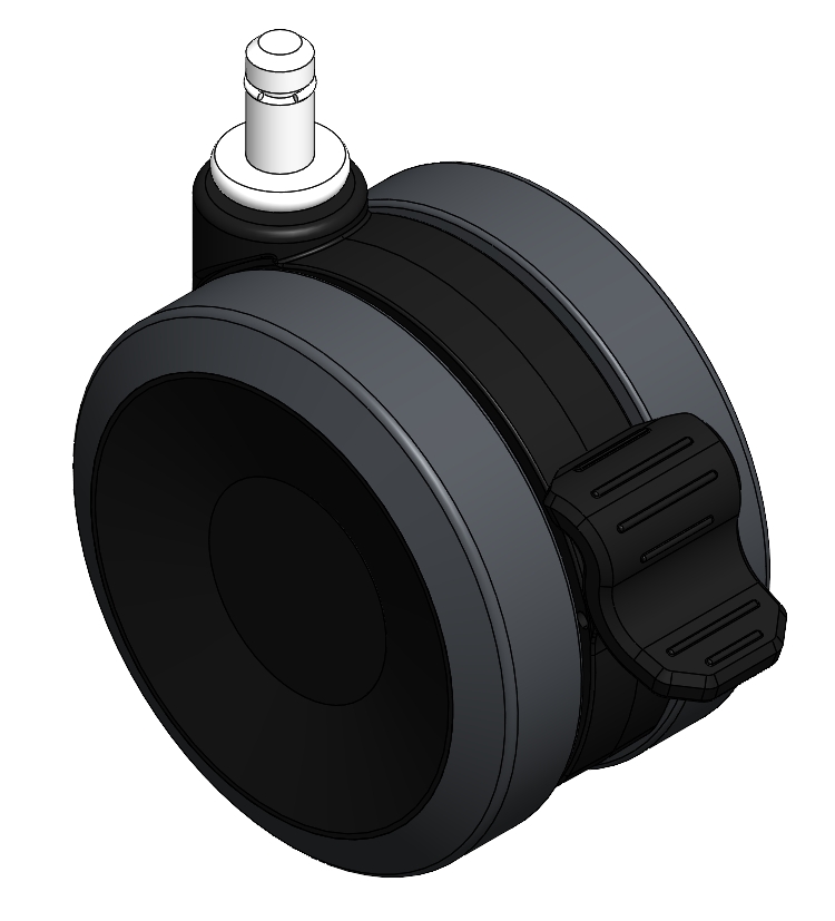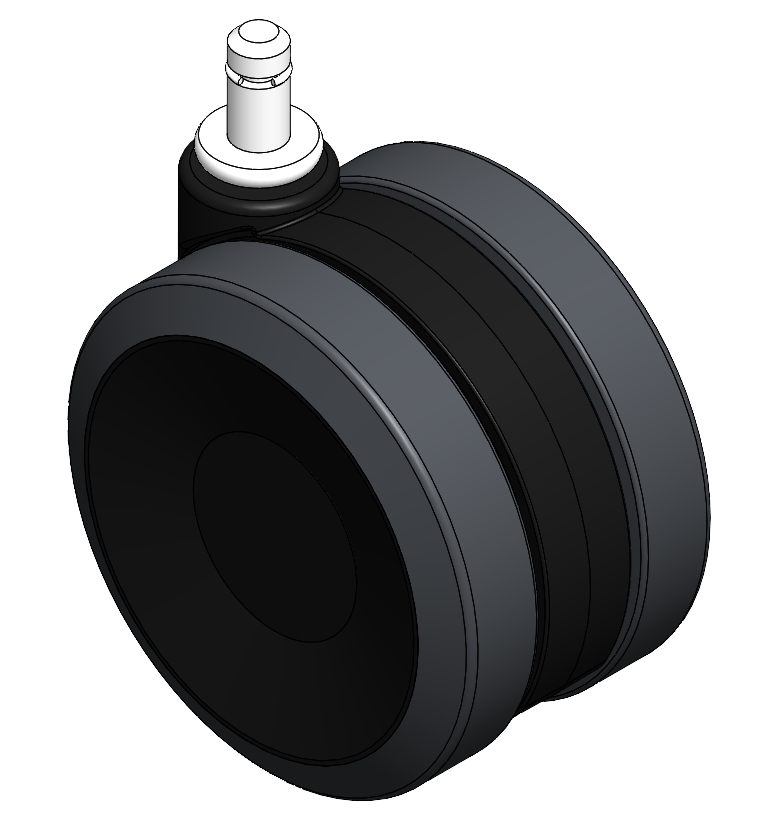 Swivel Caster, Cylindrical Stem injection-molded Fork—Ø11x22L reinforced Polypropylene Fork, insert-type Mounting Type mechanism Polypropylene (PP) core, polyvinyl chloride (PVC) tread Dark gray, Bearing—Ball Bearing. |