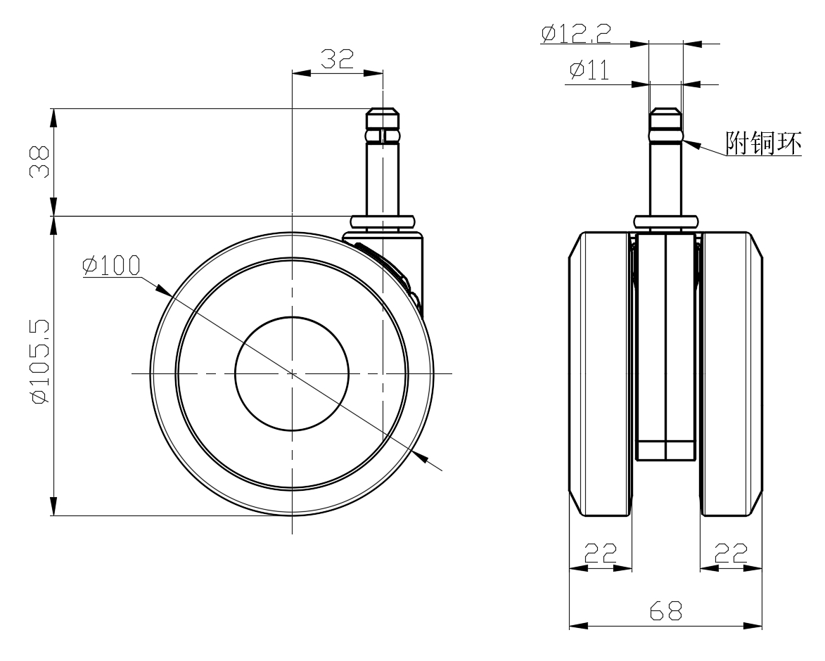 Wheel Tread: PVC polyvinyl chloride Wheel Center: PP polypropylene Drawings are for reference only and may differ from the product |