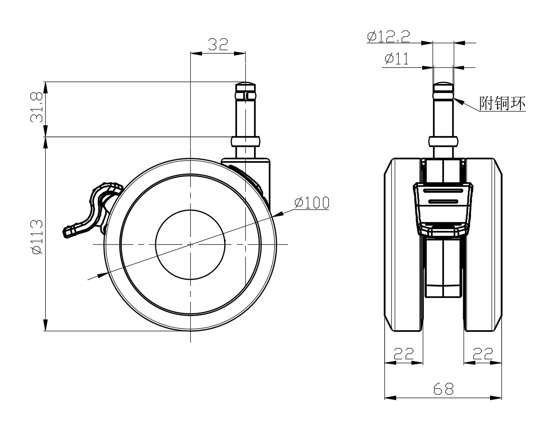 Single Brake locking system, insert-Riveted, injection-molded Fork (Ø 11 x 31.8L). reinforced Polypropylene Fork, insert-type Mounting Type mechanism. Polypropylene (PP) Wheel Center, polyvinyl chloride (PVC) tread. Dark gray, Bearing: Ball Bearing. |