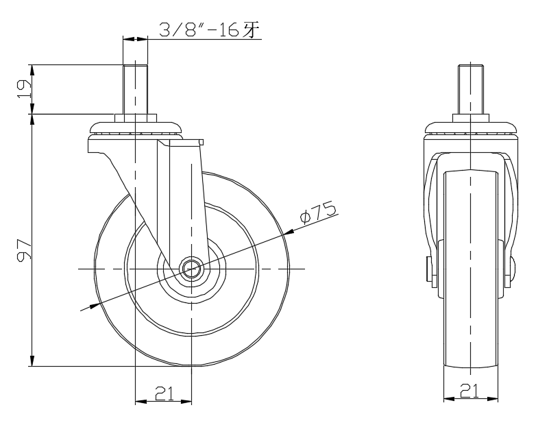 | 活動式腳輪,牙心鉚接合沖壓腳架—3/8"-16牙