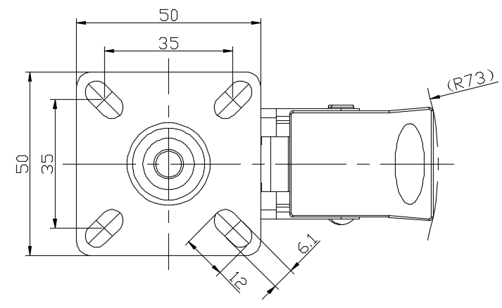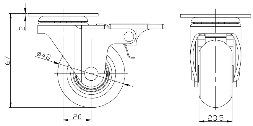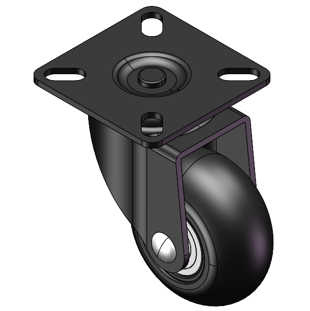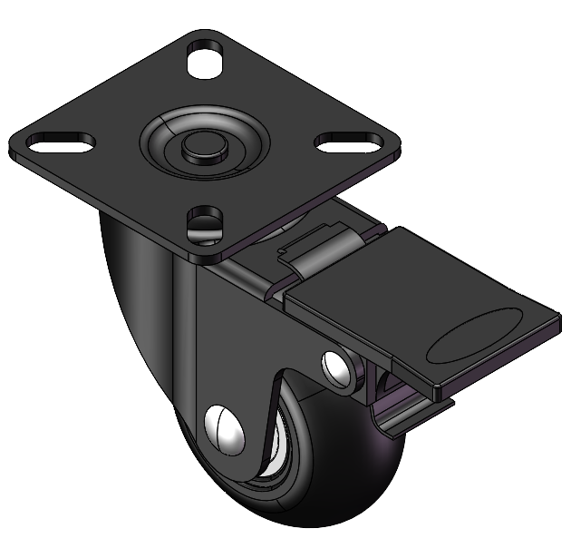 Bánh xe với cơ cấu phanh và khóa đơn. Đế bánh xe có chân đinh tán, dập và lỗ hình chữ D.