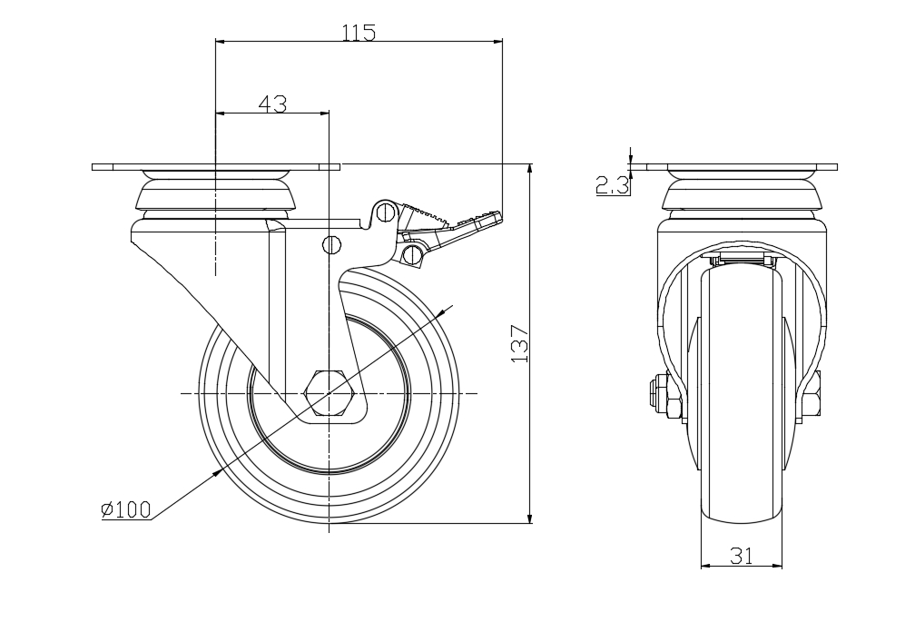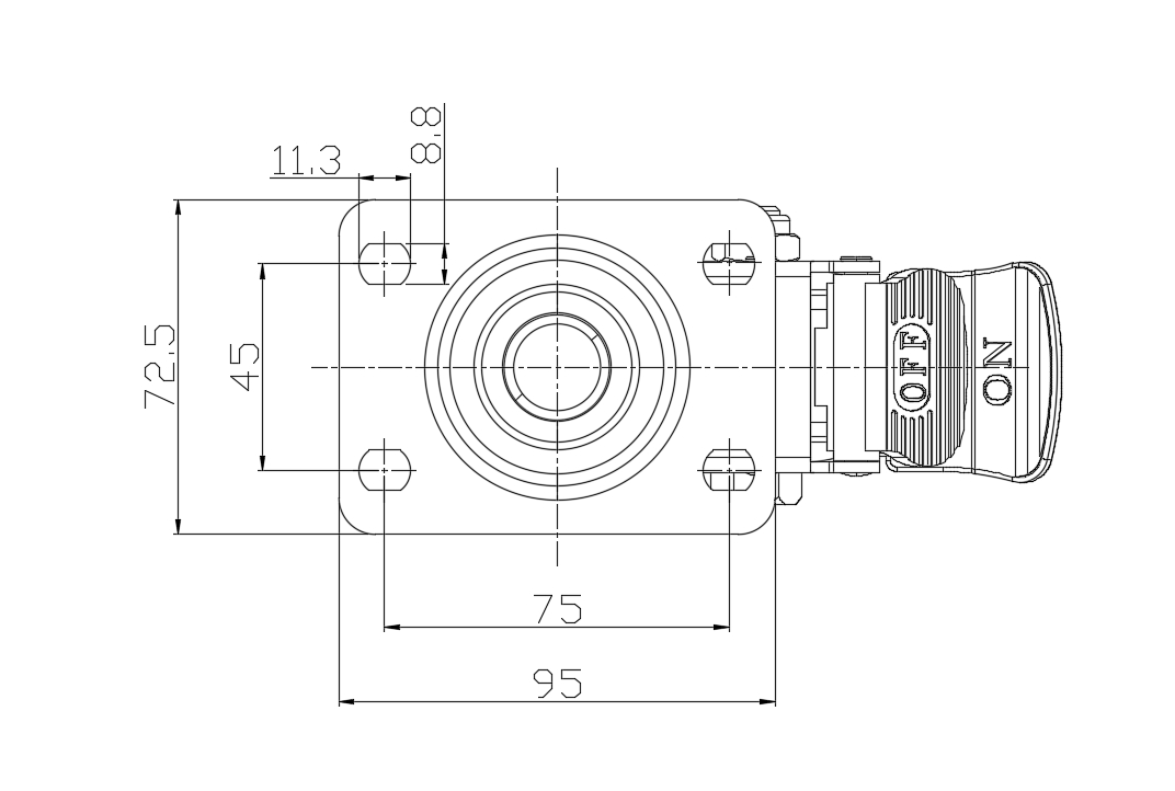 底板规格 95 x 72.5mm 底板孔距 75 x 45mm 底板孔径 11.3 x 8.8mm 偏心距 43mm 旋转干涉 230mm 总高 137mm 旋转半径 115mm 硬度 72±5° Shore A 荷重(动态) 135kgs |