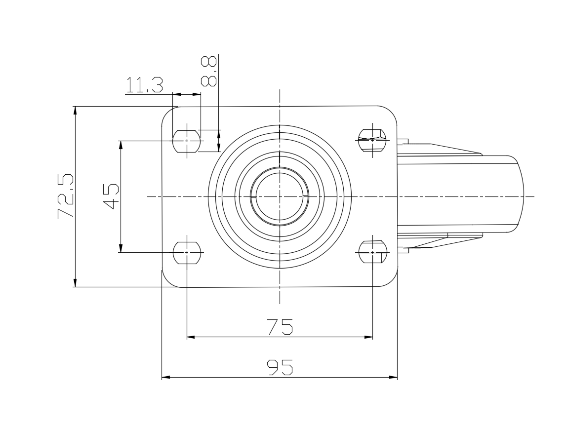 底板规格 95 x 72.5mm 底板孔距 75 x45mm 底板孔径 11.3 x 8.8mm 偏心距 35.5mm 旋转干涉 196mm 总高 162mm 旋转半径 98mm 硬度 72±5° Shore A 荷重(动态) 130kgs |