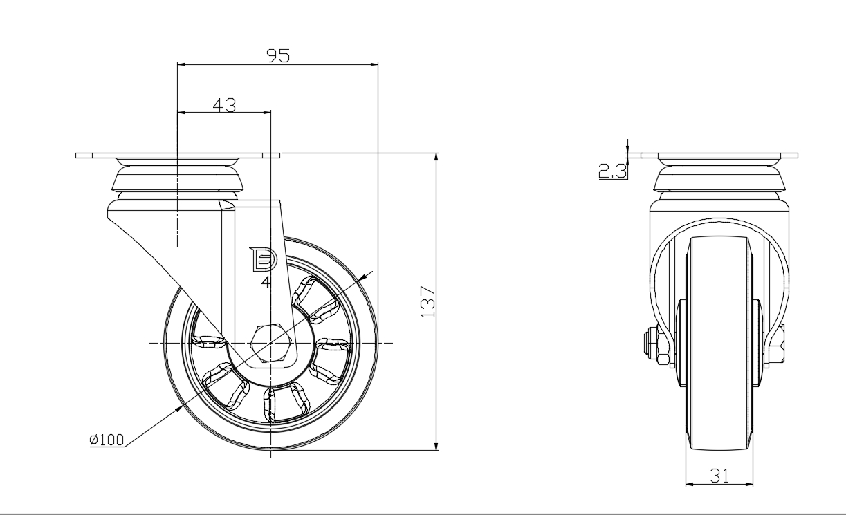 Wheel tread: Thermoplastic rubber elastomer (TPR) Wheel Center: Made of high-quality impact-resistant polypropylene Drawings are for reference only and may differ from the product |