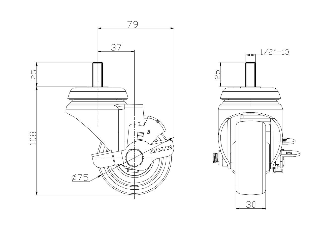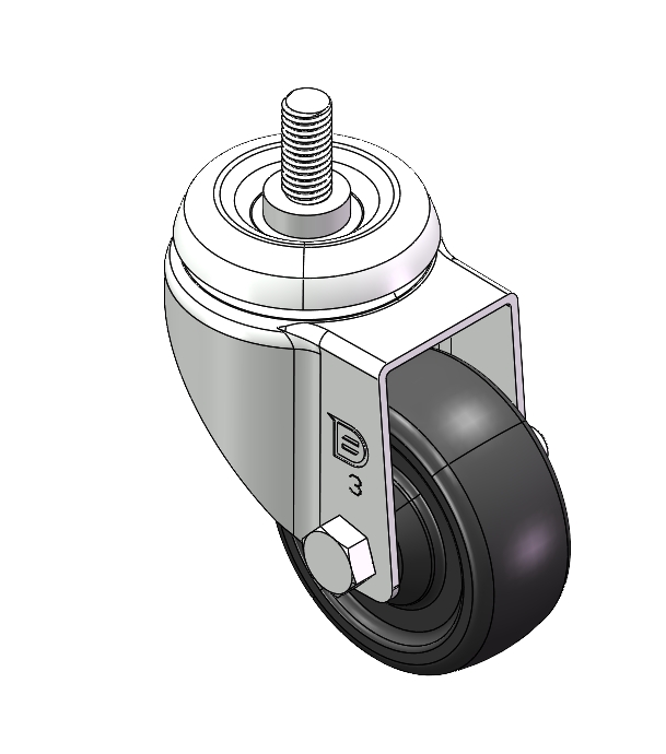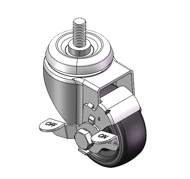 Side Brake Locking system Threaded Stamping Fork— 1/2"-13 Extended control lever surface, Mounting Type - Threaded Stem Reinforced Polypropylene, High-Quality Resilient Rubber Wheel Tread Wheels—Plain Bearing |