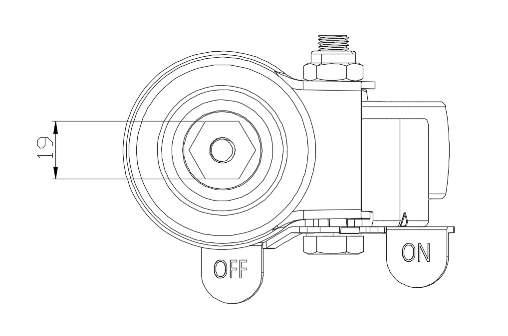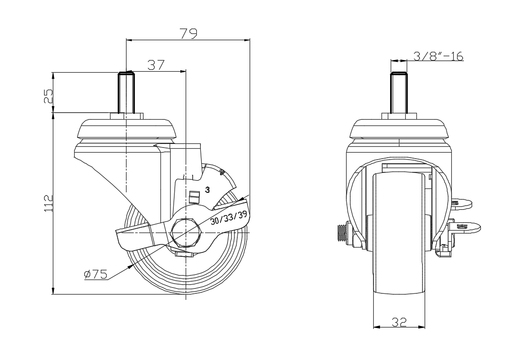 Side Brake Locking system. Thread-Riveted Fork— 3/8"-16 Extended control lever surface, Mounting Type - Threaded Stem Polypropylene Wheel Center and Wheel Tread Black, wheels—Plain Bearing. |