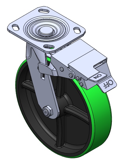 表面镀锌,底板式安装装置 铸铁制轮芯,高品质聚氨酯轮面 绿色,轮子轴承—精密长珠。 |