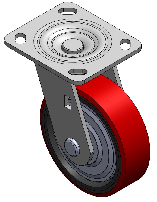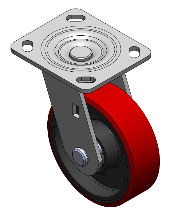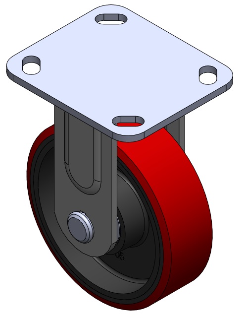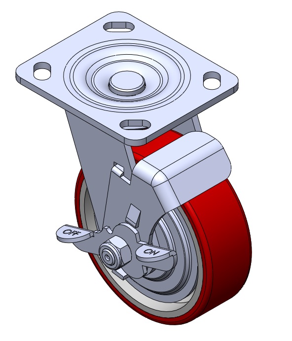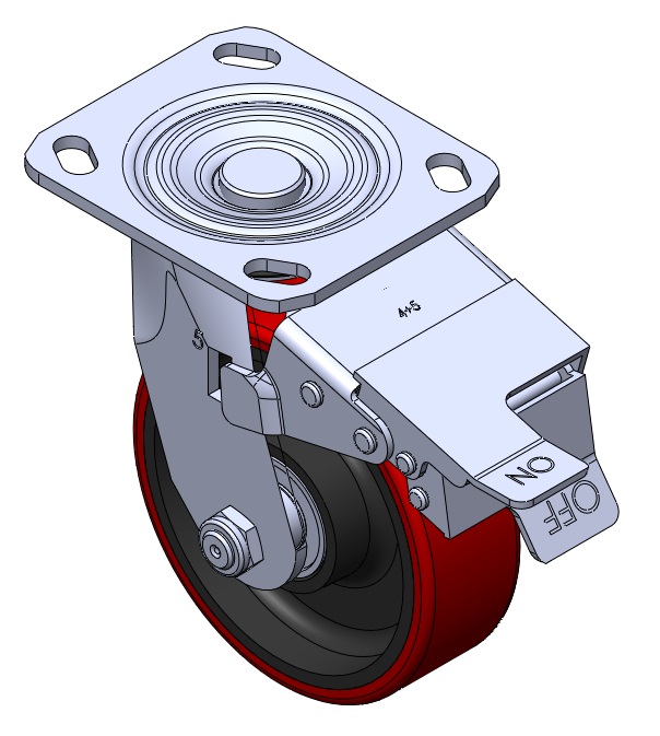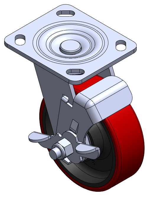 Rigid castor, Welded Caster Fork Extended control lever surface, Top Plate Mounting Type Cast Iron Wheel Center, High Quality Polyurethane wheel tread Red, Bearing - Ball Bearing. |