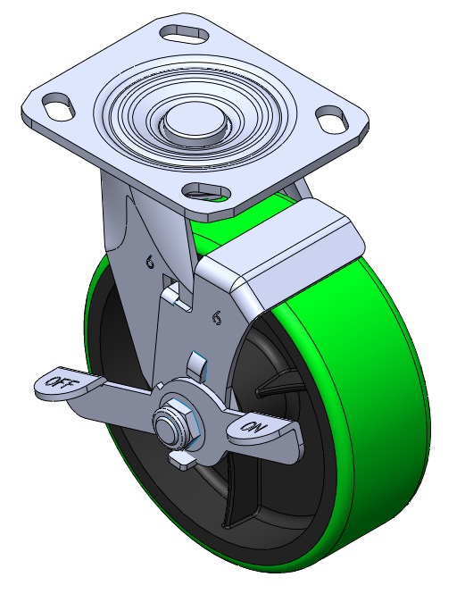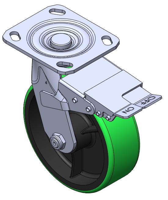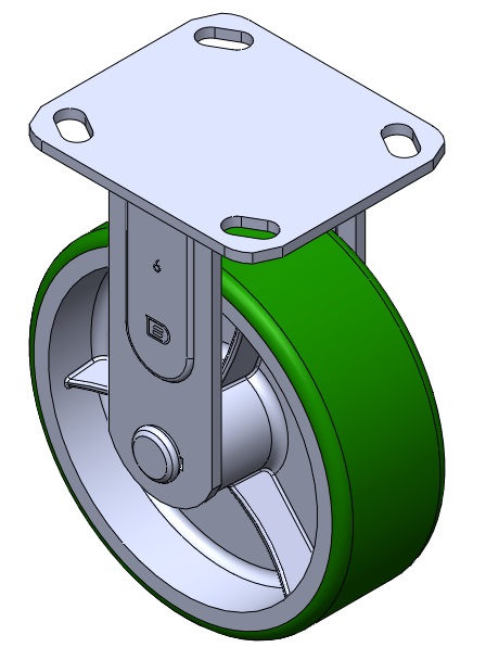 Rigid Caster with Welded Caster Fork Zine-Plated, Mounting Type - Top Plate Cast Iron core with High Quality Polyurethane Wheel Tread Green color, Bearing—Annual Ball Bearings. |