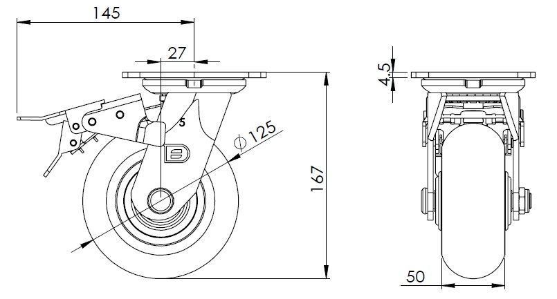 Casters with a front brake and With locking system. Welded Caster Fork. Zine-Plated. Mounting Type - Top Plate. High-Quality Impact-Resistant Polypropylene Wheel Center. High-Quality Reinforced Polypropylene Rubber (TPR) Wheel Tread. Dark gray. Bearings—Annual Ball Bearing. |