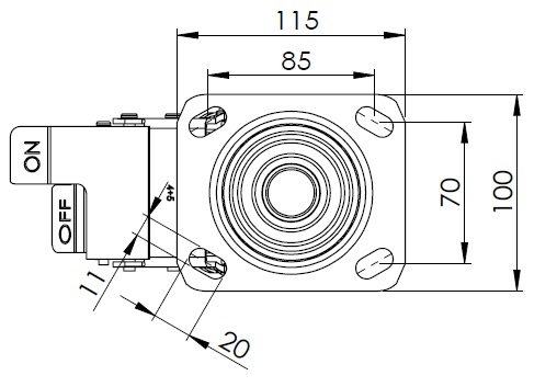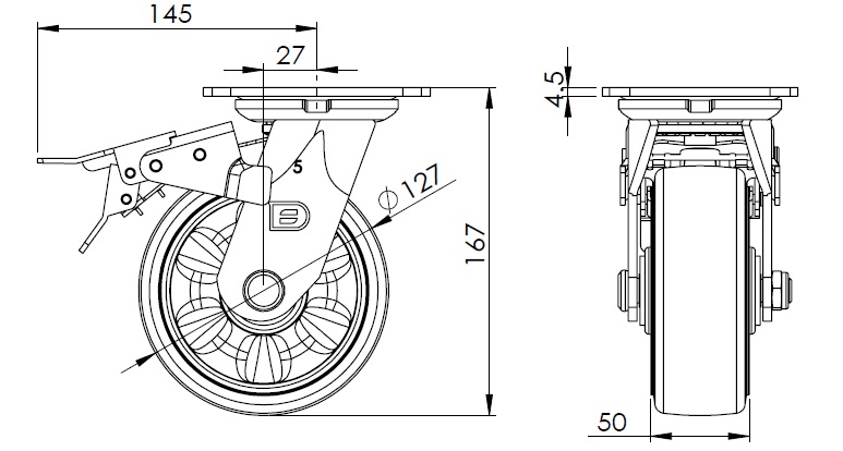 Casters with a front brake and With locking system. Welded Caster Fork. Zine-Plated. Mounting Type - Top Plate. Reinforced, impact-resistant polypropylene Wheel Center with High-Quality Reinforced Polypropylene Rubber (TPR) Wheel Tread. Dark gray. Bearings—Annual Ball Bearing. |