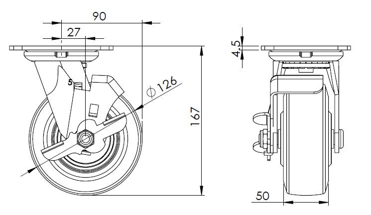 Wheel tread: high quality polyurethane Wheel Center: iron core/cast iron core Drawings are for reference only and may differ from the product |