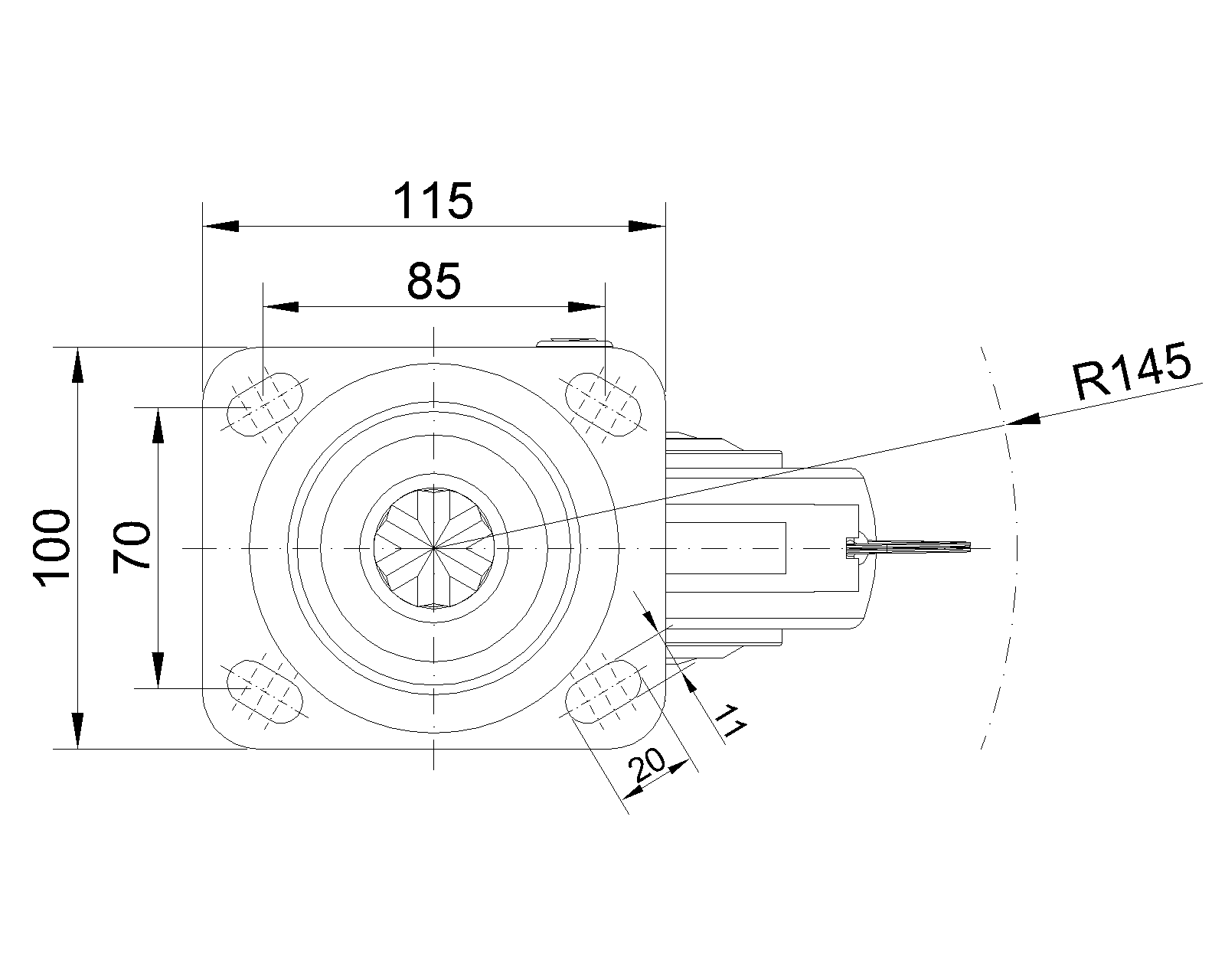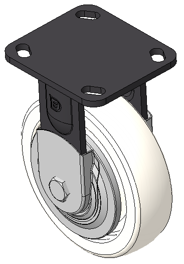 | Front-brake Casters, Welded Caster Fork, black paint finish. Base plate Mounting Type, 85x70mm Bolt Hole Spacing. Reinforced Polypropylene (PA6), natural finish. Bearings—Ball Bearings, with metal caps. |
