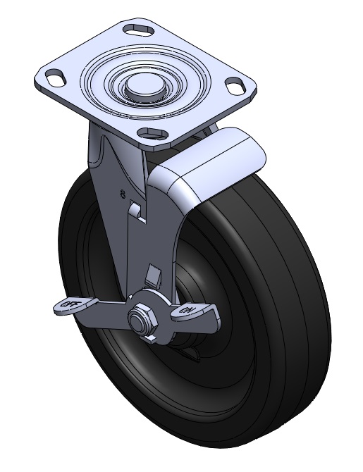 | 固定式腳輪,焊接鋼板架 表面鍍鋅,底板式安裝裝置 浸軟織物的壓縮合成樹脂輪芯、輪面 黑色,輪子軸承—精密長珠。 |