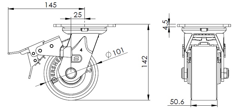 | 配有前煞式,鎖定系統的腳輪。焊接鋼板架 表面鍍鋅,底板式安裝裝置 鑄鐵製輪芯,高品質聚氨酯輪面 綠色,輪子軸承—精密長珠。 |