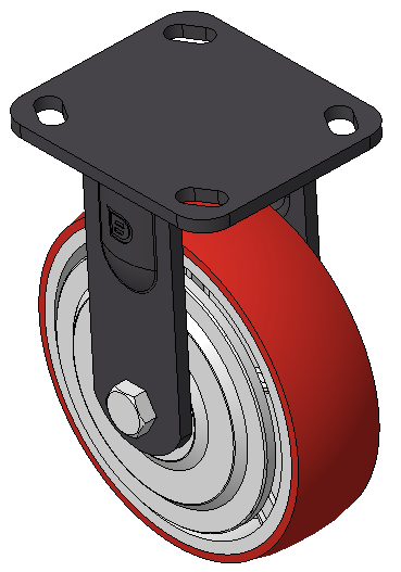 活動式的腳輪,焊接鋼板架,表面黑漆 底板式安裝裝置,孔距85x70 鑄鐵製輪芯,高品質聚氨酯輪面,銑紅色 輪子軸承—精密滾珠,附鐵蓋 |