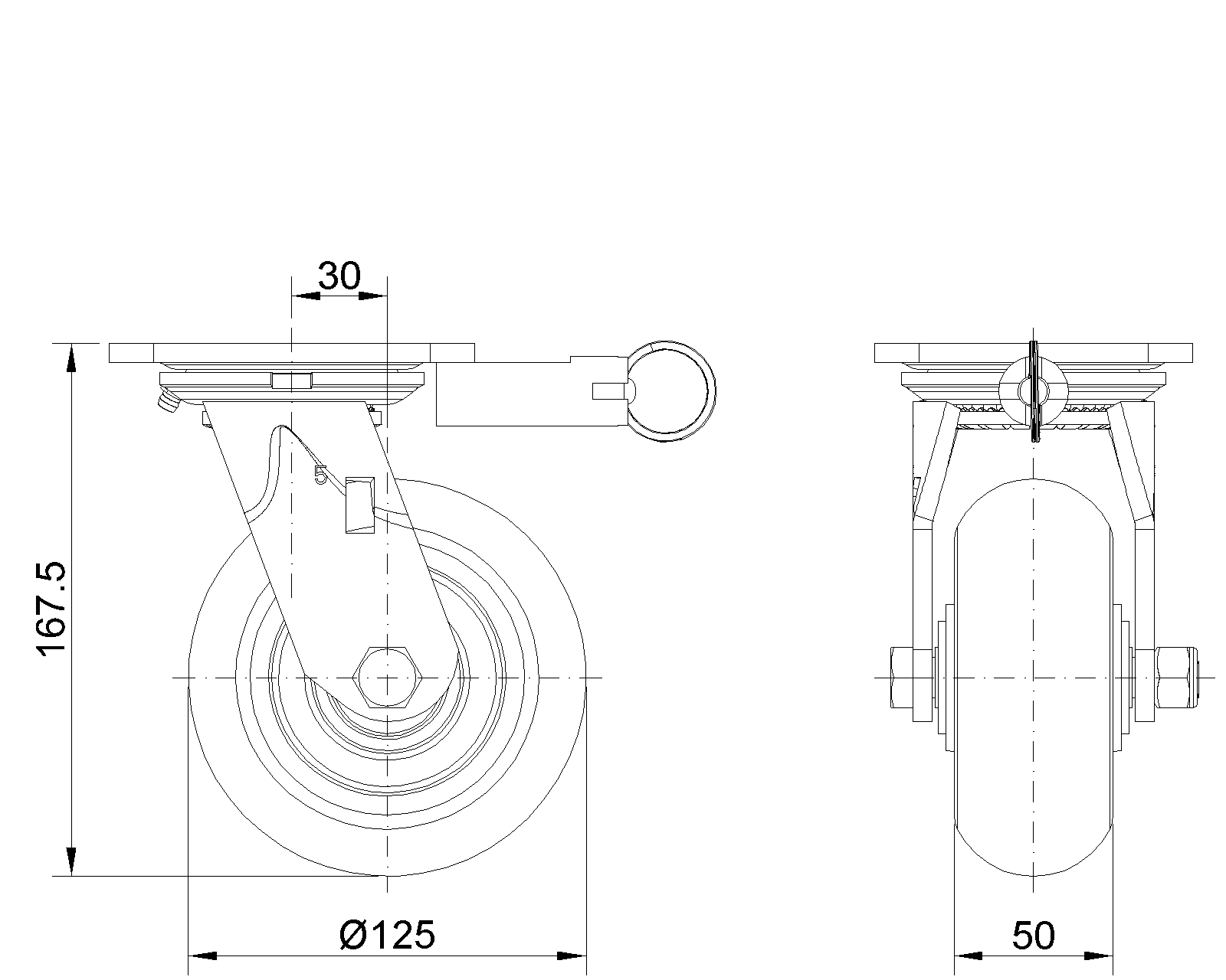 定向煞式的腳輪,焊接鋼板架,表面黑漆 底板式安裝裝置,孔距85x70 鑄鐵製輪芯,高品質聚氨酯輪面,銑褐色 輪子軸承—精密滾珠 |