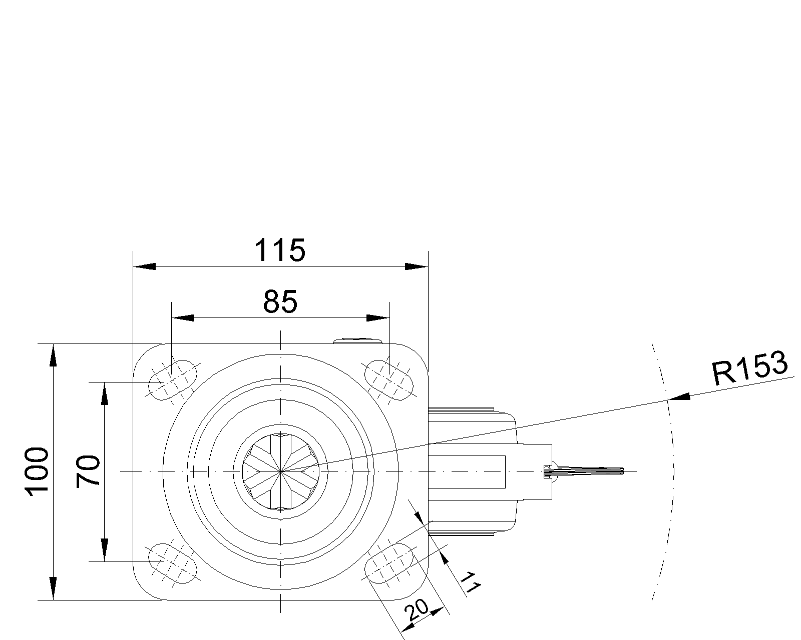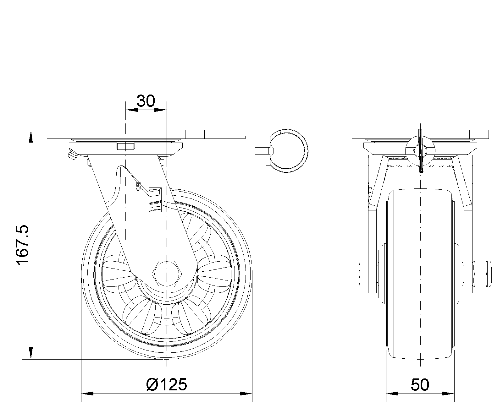 定向煞式的腳輪,焊接鋼板架,表面黑漆 底板式安裝裝置,孔距85x70 熱塑性橡膠彈性體(TPR) 銑珠光淺灰色,輪子軸承—精密滾珠 |
