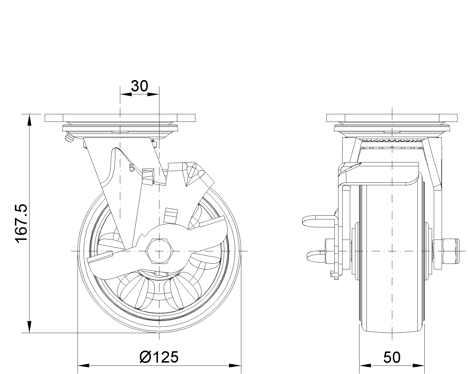 側煞式的腳輪,焊接鋼板架,表面黑漆 底板式安裝裝置,孔距85x70 熱塑性橡膠彈性體(TPR) 銑珠光淺灰色,輪子軸承—精密滾珠 |