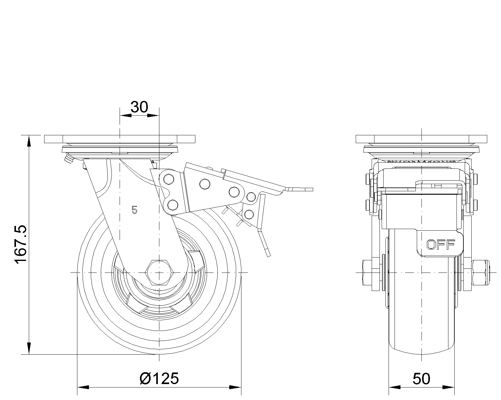前煞式的腳輪,焊接鋼板架,表面黑漆 底板式安裝裝置,孔距85x70 鑄鐵製輪芯,高品質聚氨酯輪面,銑紅色 輪子軸承—精密滾珠 |