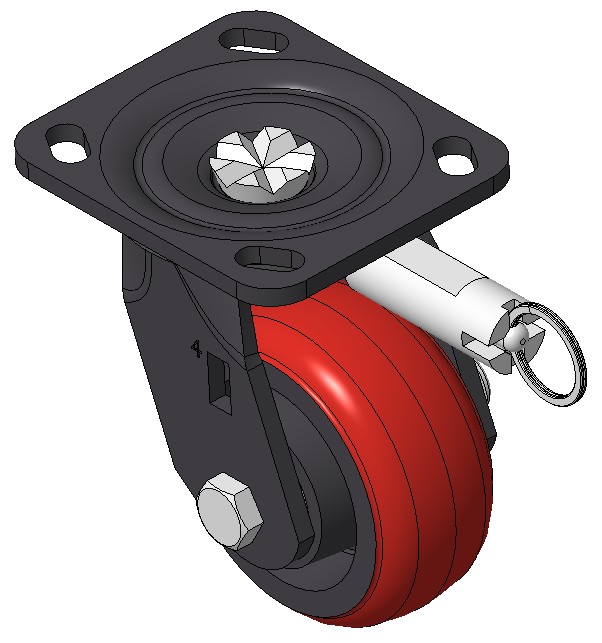 活動式的腳輪,焊接鋼板架,表面黑漆 底板式安裝裝置,孔距85x70 鑄鐵製輪芯,高品質聚氨酯輪面,銑紅色 輪子軸承—精密滾珠 |
