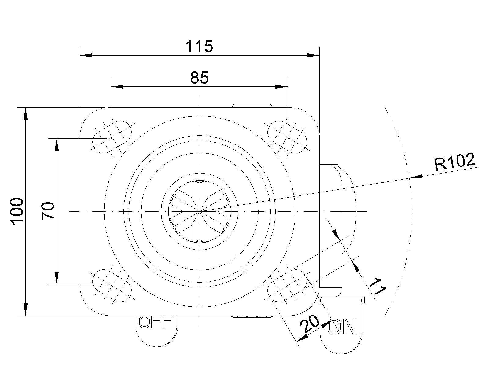 側煞式的腳輪,焊接鋼板架,表面黑漆 底板式安裝裝置,孔距85x70 鑄鐵製輪芯,高品質聚氨酯輪面,銑紅色 輪子軸承—精密滾珠 |