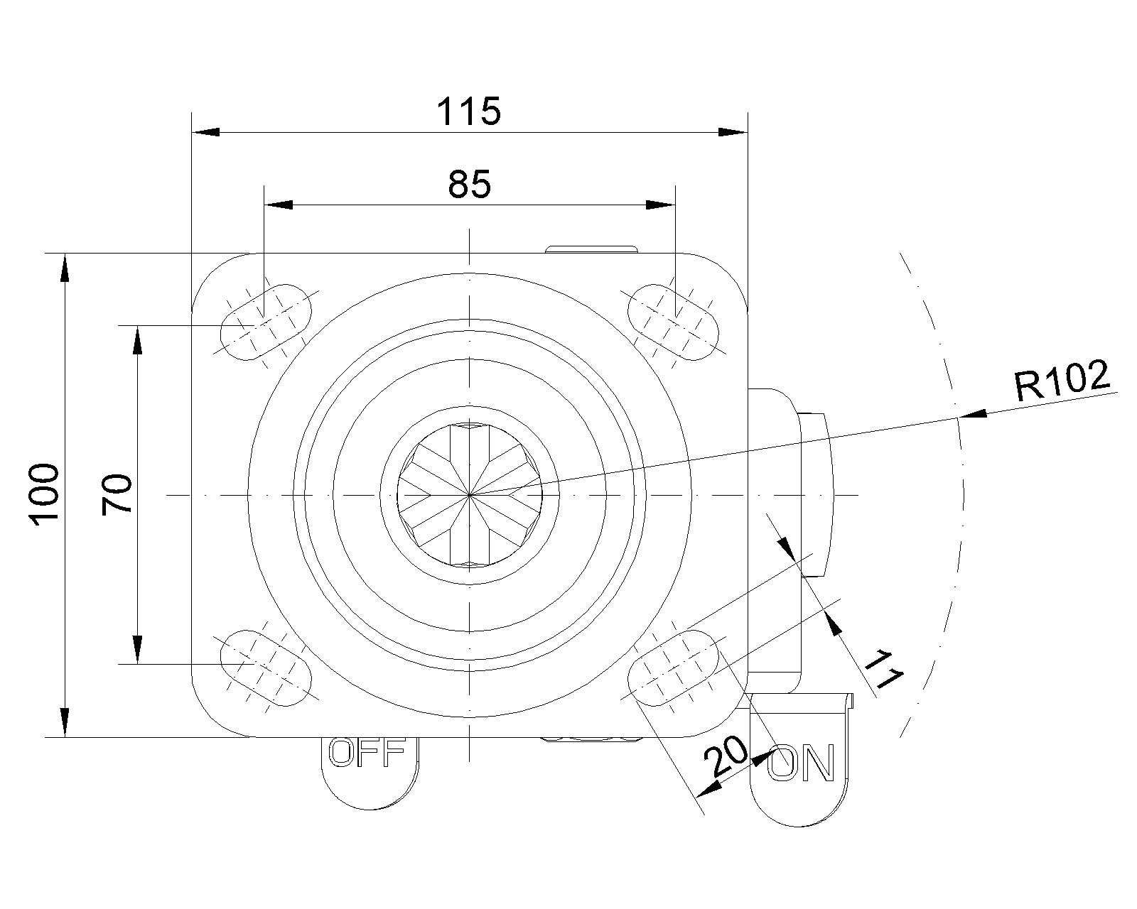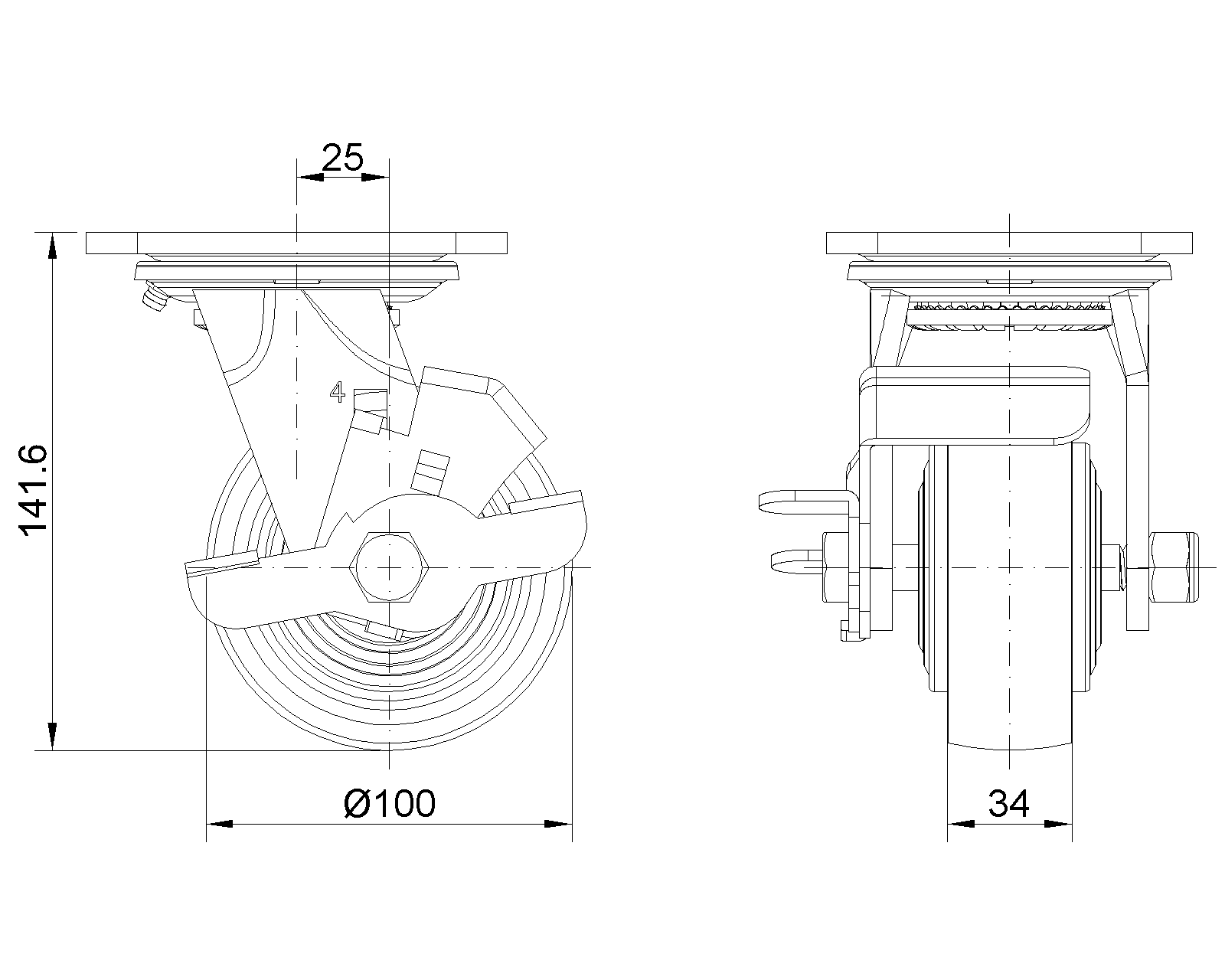 側煞式的腳輪,焊接鋼板架,表面黑漆 底板式安裝裝置,孔距85x70 鑄鐵製輪芯,高品質聚氨酯輪面,銑褐色 輪子軸承—精密滾珠,附鐵蓋 |