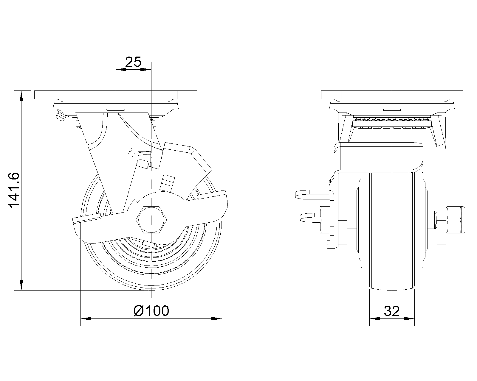 側煞式的腳輪,焊接鋼板架,表面黑漆 底板式安裝裝置,孔距85x70 熱塑性塑膠(PA6),銑原色 輪子軸承—精密滾珠,附鐵蓋 |