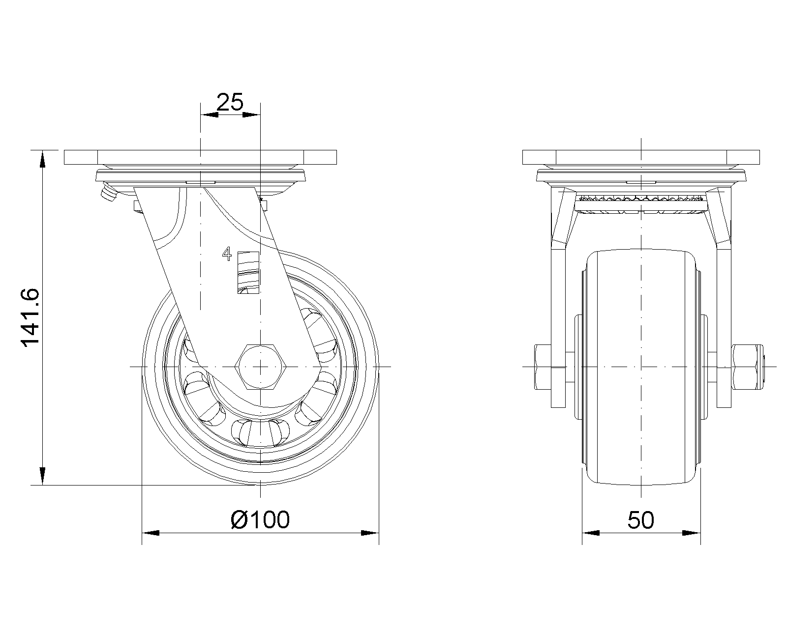 活動式的腳輪,焊接鋼板架,表面黑漆 底板式安裝裝置,孔距85x70 熱塑性橡膠彈性體(TPR) 銑珠光淺灰色,輪子軸承—精密滾珠 |